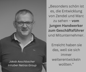 Bei der Netros Group legen wir Wert darauf, dass Mitarbeitende sich weiterentwickeln, motiviert bleiben und ihre Stärken entfalten können. Mit gezielten Optimierungen, Erfahrungsaustausch und gemeinsamer Arbeit schaffen wir nachhaltige Erfolge – für die Menschen und für die Unternehmen.
